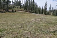 A scenic landscape in Colorado, USA. The open space is filled with lush grass, trees, and natural vegetation. Off-road tracks cut through the rugged terrain, leading to a vast wilderness. Clear skies add to the beauty of this natural environment near Antonito and La Manga Pass.