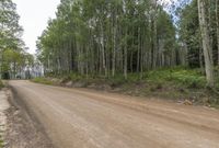 This is an image of a rural road in Crested Butte, Colorado, USA. The road surface is a mixture of dirt, gravel, and asphalt, leading through a forested landscape. The vegetation consists of grass, trees, and woody plants, blending into the natural environment. The low, rolling hills and the clear blue sky create a picturesque scene. This road is commonly used for recreational purposes, providing access to the state park and various land lots in the area. It is a perfect representation of the beautiful nature and infrastructure in Crested Butte.