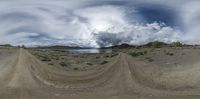 a distorted picture of an empty road near a lake and hills with clouds above the mountains