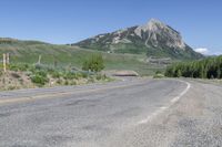 Slate River Road in Crested Butte, Colorado. Clear sky frames the majestic mountain in the background. The road surface, lined with white and yellow stripes, cuts through the dense forest, showcasing the beauty of the natural landscape.