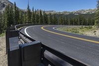 An empty asphalt road winds through the picturesque landscape of Crested Butte, Colorado. Towering mountains and dense forests filled with evergreen trees surround the road, under a clear blue sky. Armco barriers provide safety along the way.