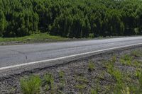 This is an image of Slate River Road in Crested Butte, Colorado. The road is made of asphalt and stretches through a picturesque landscape of forests, grass, and mountains. The clear sky overhead enhances the natural beauty of the area. Along the road, there are various types of vegetation, including evergreen trees and groundcover. This photo captures the tranquility of nature and the serene atmosphere of Crested Butte. It is a perfect representation of the scenic beauty found in Colorado.