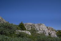 a person with a backpack on a cliff above some trees and plants, overlooking a large rocky hill, while looking up at the sky