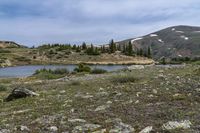This image captures the rugged and natural beauty of Colorado, USA. The landscape features a mountainous terrain with open spaces filled with grass and vegetation. A dirt road winds through the highlands, leading to Loveland Pass and Pass Lake. The cloudy sky reflects on the serene lake, surrounded by fluvial landforms and rocky bedrock. The off-road track is covered with gravel and showcases the diverse flora, including colorful flowers. This scenery represents the untouched natural environment of Colorado, offering abundant water resources and a peaceful atmosphere.