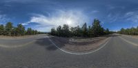 Asphalt road in Colorado leading straight to Pikes Peak. Daytime landscape with hard shadows and clouds looming overhead. Shadows stretch one quarter down the road, creating a dramatic USA nature scene.