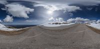 Aerial view of a snow-covered road in Colorado leading to Pikes Peak summit. Clouds contrast with the clear day. The elevated overlook provides an overview of the high position, with a parking lot in the foreground.