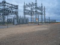 A gloomy day in Colorado, with grey skies looming over a vast landscape. A power plant sits on a dirt surface, surrounded by gravel areas. The desolate nature adds to the somber atmosphere.