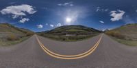 Colorado landscape at dawn, with open snowy spaces and asphalt roads. The sun peeks over the horizon, casting hard shadows. Nature's beauty highlighted in the USA. A serene winter sunrise scene.