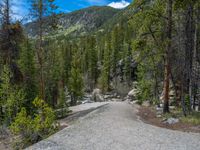Scenic landscape of Colorado, USA, showcasing straight roads flanked by dense forests of aspen trees. Clear day with fluffy clouds overhead, highlighting the natural beauty of the rocky terrain.