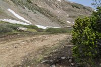 Rugged alpine landscape in Colorado's Loveland Pass. Snow-covered slopes contrast with highland vegetation and tree-lined tracks. Off-road adventure awaits on the dirt and gravel mountain roads. A picturesque day in the USA's scenic nature.