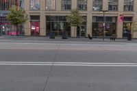 This stock photo depicts a city scene in Denver, Colorado, showcasing modern architecture. The image features an empty city street surrounded by mixed-use buildings, with a big building dominating the skyline. The tall windows on the top of the building add to the architectural appeal. The use of concrete in the street and façade enhances the urban design. The image reflects the dynamic city life and infrastructure of the metropolitan area. The photo was taken during the day, capturing the vibrant urban atmosphere. There is also a bar and a bicycle visible in the scene, highlighting the presence of public spaces and the bike-friendly nature of the city.