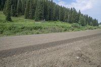 This is an image taken in the highlands of Colorado, USA. The photo depicts a rural landscape with mountains in the background. A road made of sand, dirt, and asphalt winds through the scene, surrounded by grass, trees, and vegetation. The road surface transitions from gravel to sand as it ascends a slope, leading to Kebler Pass and Crested Butte. The evergreen trees and larches dot the landscape, creating a picturesque alpine setting. This photo captures the beauty and tranquility of the Colorado highlands.