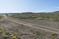 Off-road adventure in Colorado's Crested Butte. Vehicles traverse a dirt track through the stunning landscape of mountains, trees, and shrubbery. Clear sky adds to the natural beauty of the day.