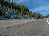 Scenic road in the Colorado mountains, covered in a blanket of snow. Majestic forest and towering trees line the roadside, creating a picturesque winter landscape. Cloudy skies add depth to the scene.