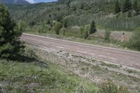 An off-road track in Colorado, USA, surrounded by lush green vegetation. The elevated mountain pass provides a breathtaking landscape. A dirt road winds through the forest, leading to a land lot in Telluride.