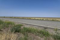 A scenic view of a road cutting through the Colorado plains. The asphalt highway stretches into the horizon, surrounded by nature and grassy fields. Clear skies create a beautiful backdrop.