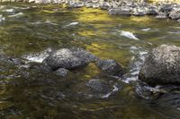 A picturesque view of the Taylor River in Colorado, USA. The fluvial landforms and rocky bedrock create a stunning landscape. The riparian zone with grassy banks enhances the natural beauty of this open space. Enjoy a peaceful autumn day by the water.