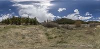 a green grassy field with a tree line behind it and some clouds in the sky