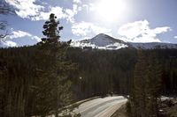 Scenic highway in Colorado, USA, winds through a picturesque valley. Snow-capped mountains loom in the distance, framed by towering trees. An empty road invites exploration of the breathtaking landscape.