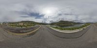 A unique perspective of a straight road leading to a beautiful lake in Colorado, USA. The fish eye lens captures the expansive landscape and open space. A perfect spot for RV camping and enjoying nature.