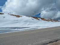 Snow-covered road in Colorado leading to Pikes Peak summit. Asphalt contrasts with white landscape. Cloud-filled skies on a chilly USA day, showcasing the beauty of nature.