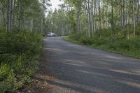 A car parked in the middle of an open road surrounded by the scenic Colorado forest. Trees line the roadway as the sun rises, casting a beautiful glow. Nature lovers can explore the picturesque landscape of Telluride at Sunrise Campground.