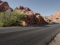 an empty desert road in the mountains near rocky formations and bushes, with two red rocks to the left