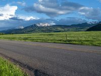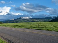 Rural landscape of Colorado at dawn, featuring lush greenery and farm lands. Asphalt road winding through mountainous terrain. Clouds scatter the sky as the sun rises over the agricultural scenery.