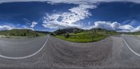 a street with some green hills and a sky in the background while in two pictures one shows an open road, the other has hills