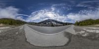 a panoramic photo of an empty road at the bottom of mountains, with a mountain in the background