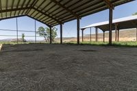 the inside of an empty barn with hay around and on the floor is a big open air shelter