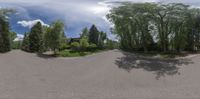 Sunny day in Colorado suburb. Asphalt road curves through open space with gravel and dirt surfaces. Residential area with visible hard shadows. Nature meets suburban landscape under clear sky.