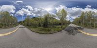 two roads are shown on a sunny day with no cars on the road to the left