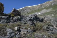 person with a backpack standing on top of a mountain slope covered in rocks and green grass