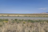 A rugged landscape in Colorado, USA. The asphalt road cuts through the grassy plains and steppe, highlighting the natural beauty of the area. The clear sky provides a picturesque backdrop to this serene natural environment.