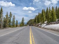 A straight road stretching into the distance in Colorado, USA. Lined with asphalt, it is surrounded by beautiful natural landscape and framed by clouds. A perfect day for a scenic drive to the summit.