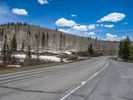 A panoramic view of a road in Colorado, USA. The road cuts through a snowy landscape, surrounded by open spaces and a beautiful lake. Clouds fill the sky, creating a serene winter scene.