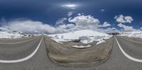 a split up image showing snow, mountains and a sky with clouds in it the road looks to be covered in snow