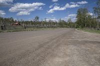 an empty dirt road in front of wooden fences and clouds overhead a large tree lined fence is at the edge of the street