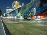 This stock photo showcases a colorful building located in Berlin, Germany. The modern architecture of the building, along with the art piece on the wall and the lights around it, creates a visually stunning scene. The building is situated in a metropolitan area, surrounded by asphalt roads. The mixed-use corporate headquarters features a unique facade with clean lines. The building is also part of an urban design that incorporates a courtyard and a warehouse converted into a gallery. The image captures the dynamic energy of city life, with graffiti walls adding a touch of urban artistry. The photo was taken at night, with clear skies and artificial lights illuminating the scene. The photo is a perfect representation of the art district in Berlin's urban landscape, also known as Hinterhof.