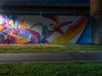 a colorful painted mural next to the street light at night in a building underpass