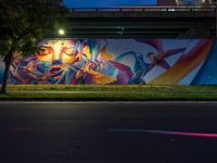 A vibrant mural on the wall of an underpass in Taipei, Taiwan. Street light illuminates the artwork, creating a colorful spectacle. The clear night sky and motion blur of passing vehicles add to the dynamic atmosphere.