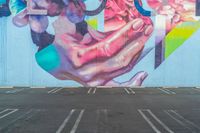 This stock photo showcases a large, colorful mural painted on the side of a building in Los Angeles, California. The vibrant artwork covers the entire wall and features various graffiti designs. The image captures the urban charm of the city, highlighting the street art culture and artistic expression in the bustling art district. This aerial shot provides a top-down perspective, giving viewers a unique view of the artwork from a high position. The mural stands out against the asphalt surface of the surrounding parking lot. With no people in sight, this daytime photo is a great choice for illustrating urban design, graffiti, and city life in Los Angeles, USA.