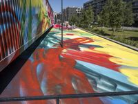 This stock photo showcases a vibrant painting with colorful colors on the floor of a train carriage in the city of Berlin, Germany. The modern architecture of the buildings and the elevated infrastructure can be seen in the background. The open space provides an urban feel, with graffiti art adorning the walls. The red and yellow hues of the painting contrast beautifully against the asphalt road and concrete curb. This image captures the urban design and lively city life of Berlin, making it perfect for various creative projects related to art, architecture, and urban culture in Europe.