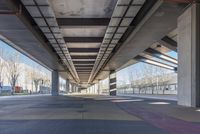 the underside of an overpass shows many areas with colorful tiles and lines of paint