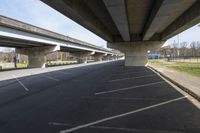 This stock photo features a view of two overpasses over the roadway on an empty road between two other bridges. Situated near a park, this scene showcases the concrete bridge and its surroundings. The road surface, made of asphalt, leads to open space and shaded areas with trees. The cloud-filled sky provides a picturesque backdrop for this thoroughfare. A perfect image for showcasing urban infrastructure, transportation, and park-related concepts. Also suitable for illustrating the use of concrete in construction and parking structures.