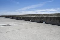 A coastal landscape in Ontario, Canada. A concrete bridge spans a reservoir, with the ocean and horizon in the distance. The road surfaces and jetty lines add to the architectural charm of this vacation spot in Toronto.