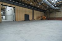 Modern architecture in Berlin, Germany. The concrete building with hardwood floors and plywood ceilings stands tall amidst an industrial landscape. Open spaces and roads surround the factory warehouse.
