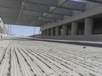 A stunning view of a concrete garage with large columns and a concrete wall. The road area in the background adds to the urban vibe of the city. This architectural marvel showcases the beauty of Brutalist architecture and the vibrant cityscape. The low concrete bridge and underpass connect different parts of the city, while the walkway provides a pathway for pedestrians. The building stands tall under the clear sky, making it an impressive sight during the day. The stadium and urban thoroughfare highlight the bustling life of Los Angeles.