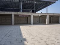 Modern office building in the heart of Berlin's business district. The concrete architecture showcases clean lines and minimalistic design. Empty open spaces in the parking garage await visitors. A clear sky highlights the European charm of the city.